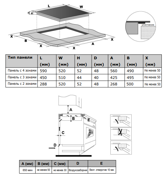 Характер огранки фаски на внешней стороне варочной панели. Металлические рамки предотвращают забивание монтажных швов крошками и пылью.