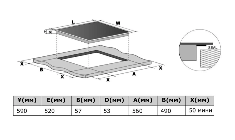 Характер огранки фаски на внешней стороне варочной панели. Металлические рамки предотвращают забивание монтажных швов крошками и пылью.