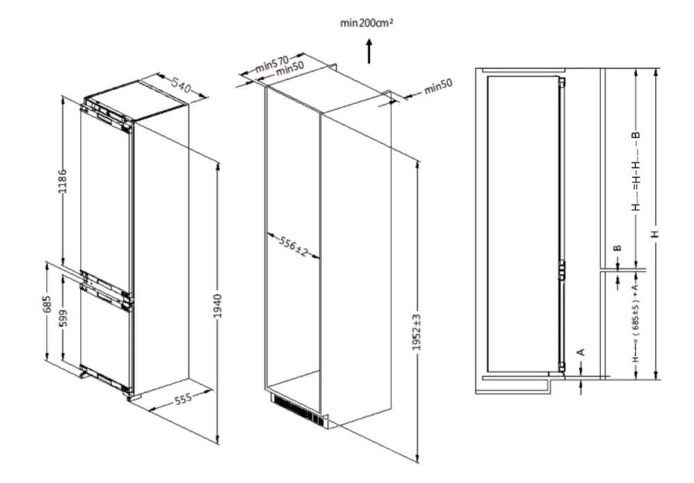 холодильник-морозильник встраиваемый, 305 л, класс энергопотребления А, No Frost, 54х54,5х193,7 см