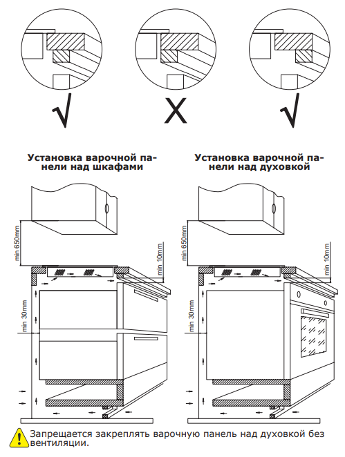 Характер огранки фаски на внешней стороне варочной панели. Металлические рамки предотвращают забивание монтажных швов крошками и пылью.