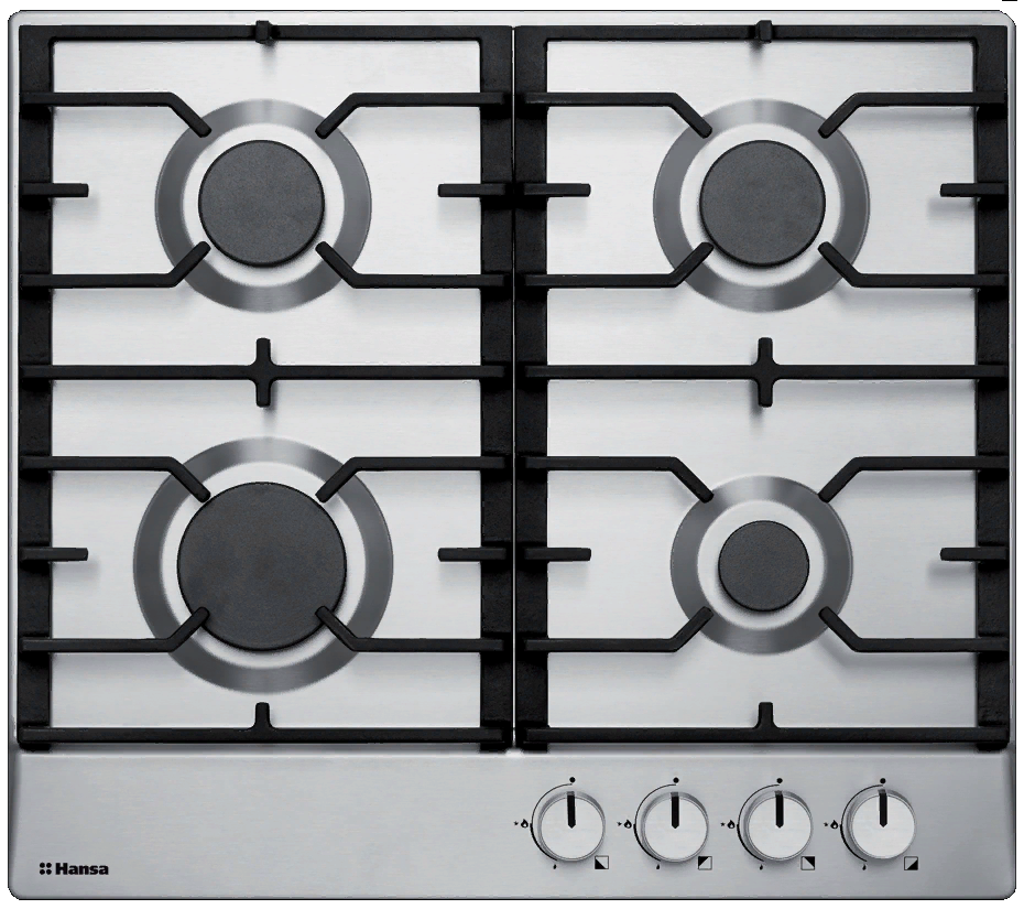 поверхность газовая, 60 см, газ на металле, 4 конфорки, решетки чугунные, нержавеющая сталь