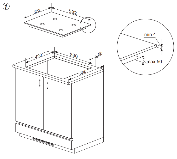 Характер огранки фаски на внешней стороне варочной панели. Металлические рамки предотвращают забивание монтажных швов крошками и пылью.