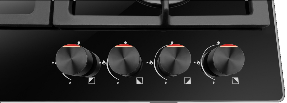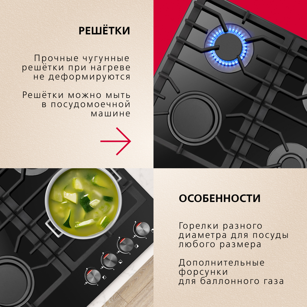 поверхность газовая, 60 см, газ на стекле, 4 конфорки, решетки чугунные, черный