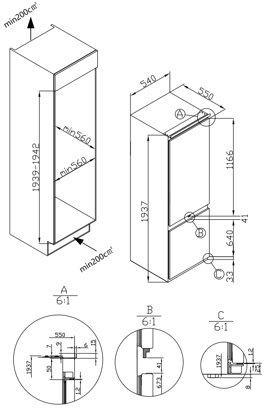 холодильник-морозильник встраиваемый, 281 л, класс энергопотребления А+, NoFrost, 54x54x176,9 см