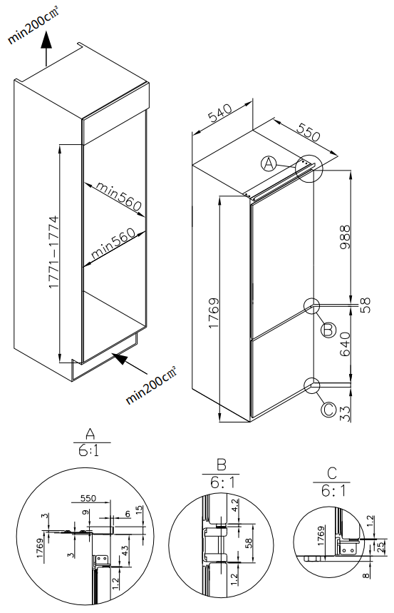 холодильник-морозильник встраиваемый, 270 л, класс энергопотребления А++, ручная система размораживания, 54x55x176,9 см