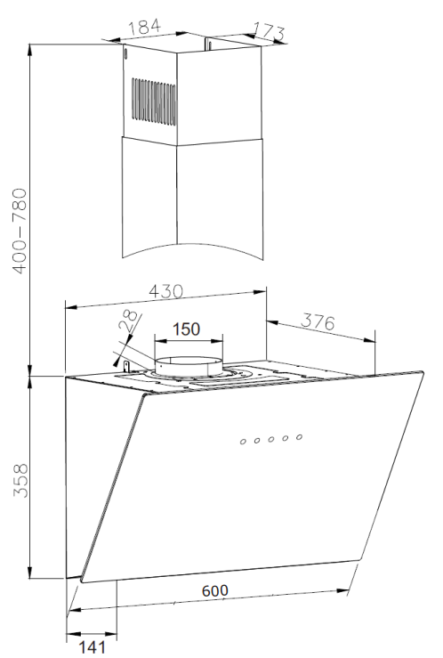 вытяжка наклонная, 60 см, 930 м3/ч, черное стекло
