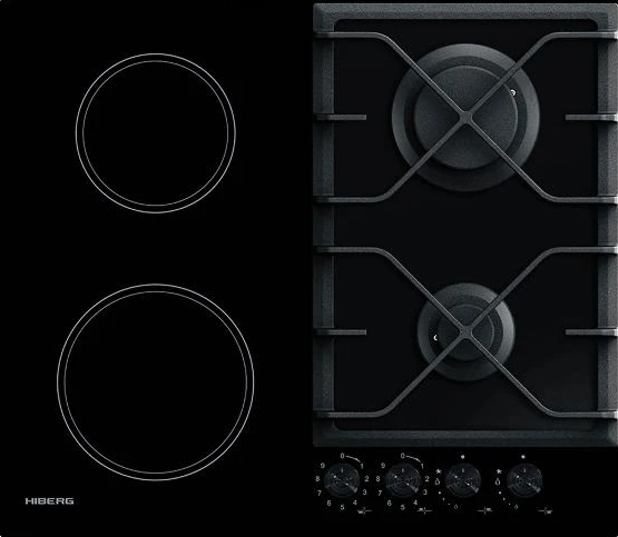 поверхность комбинированная, 60 см, 4 конфорки (2 - газовых, 2 - HiLight), решетки чугунные, черный