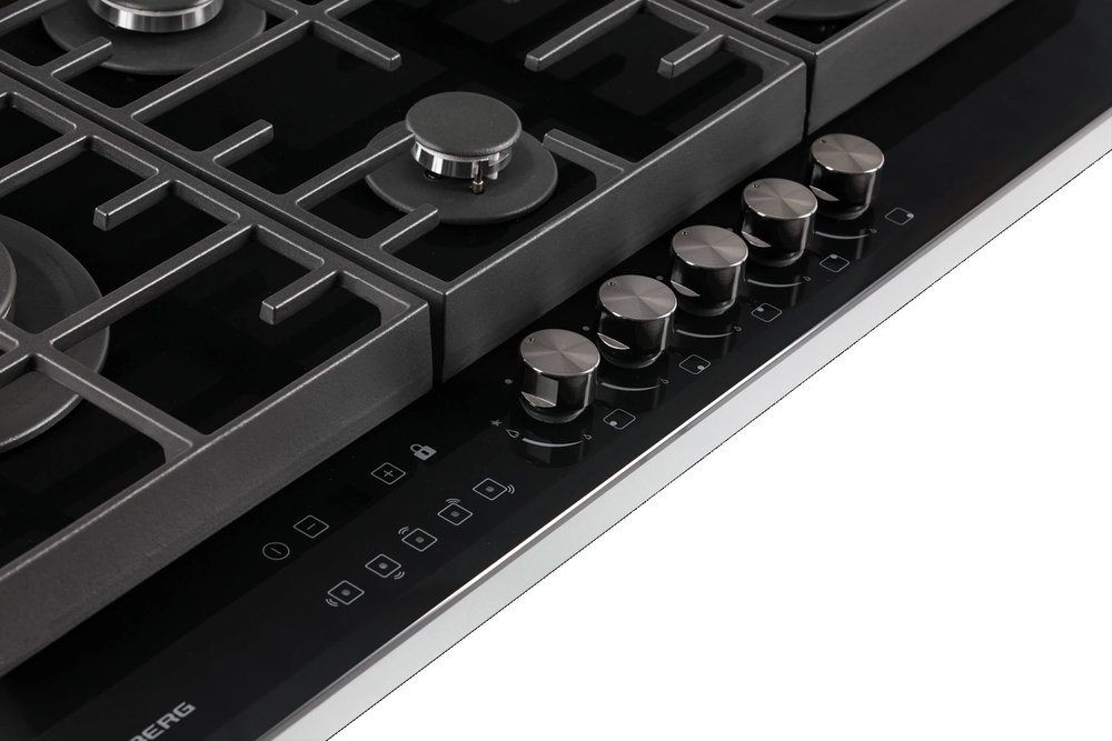 поверхность газовая, 87 см, газ на стекле, 5 конфорок, решетки чугунные, черный (2 комплекта ручек)