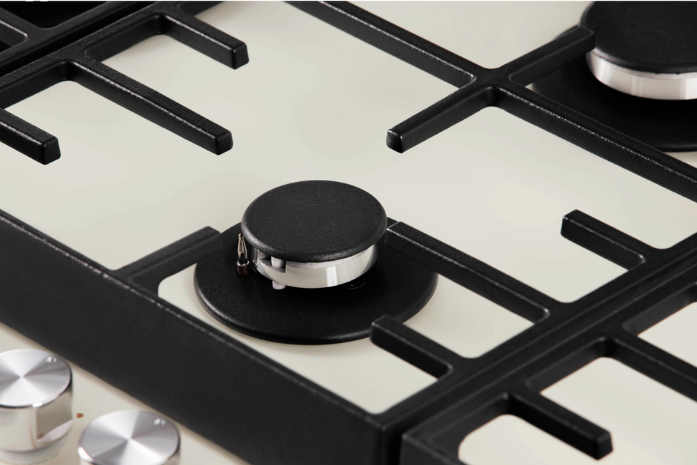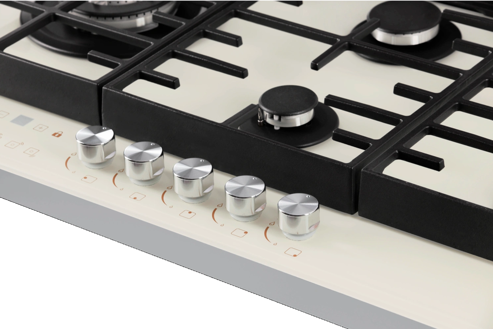 поверхность газовая, 87 см, газ на стекле, 5 конфорок, решетки чугунные, бежевое стекло (2 комплекта ручек)