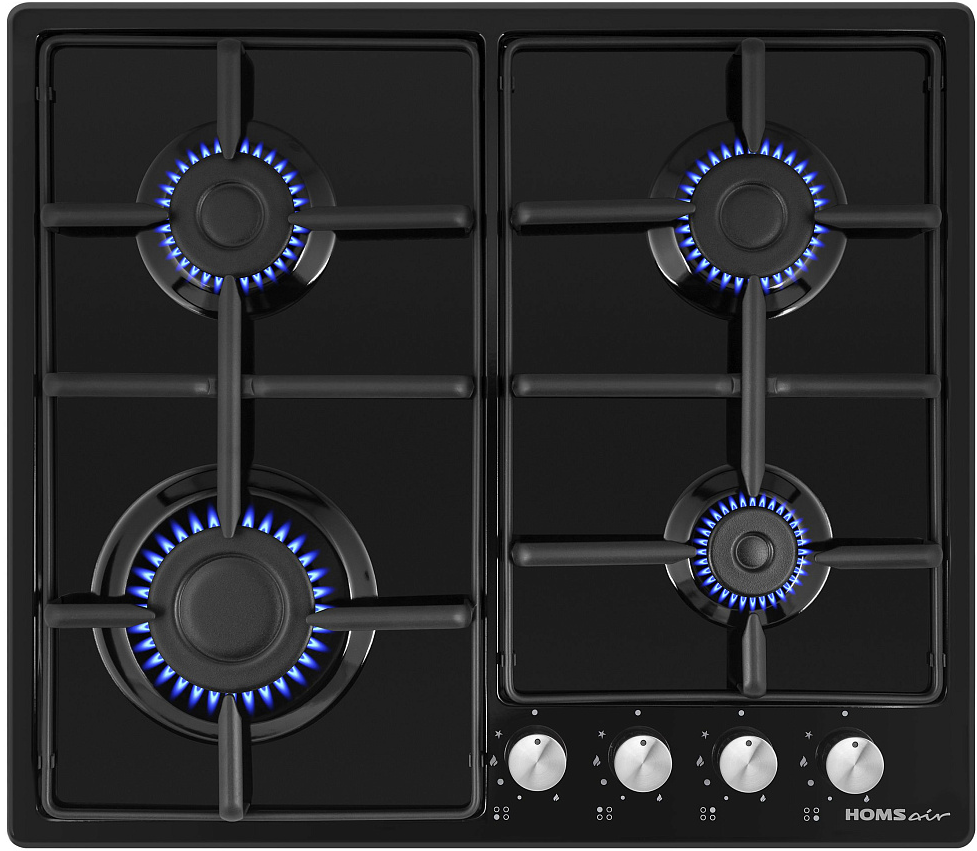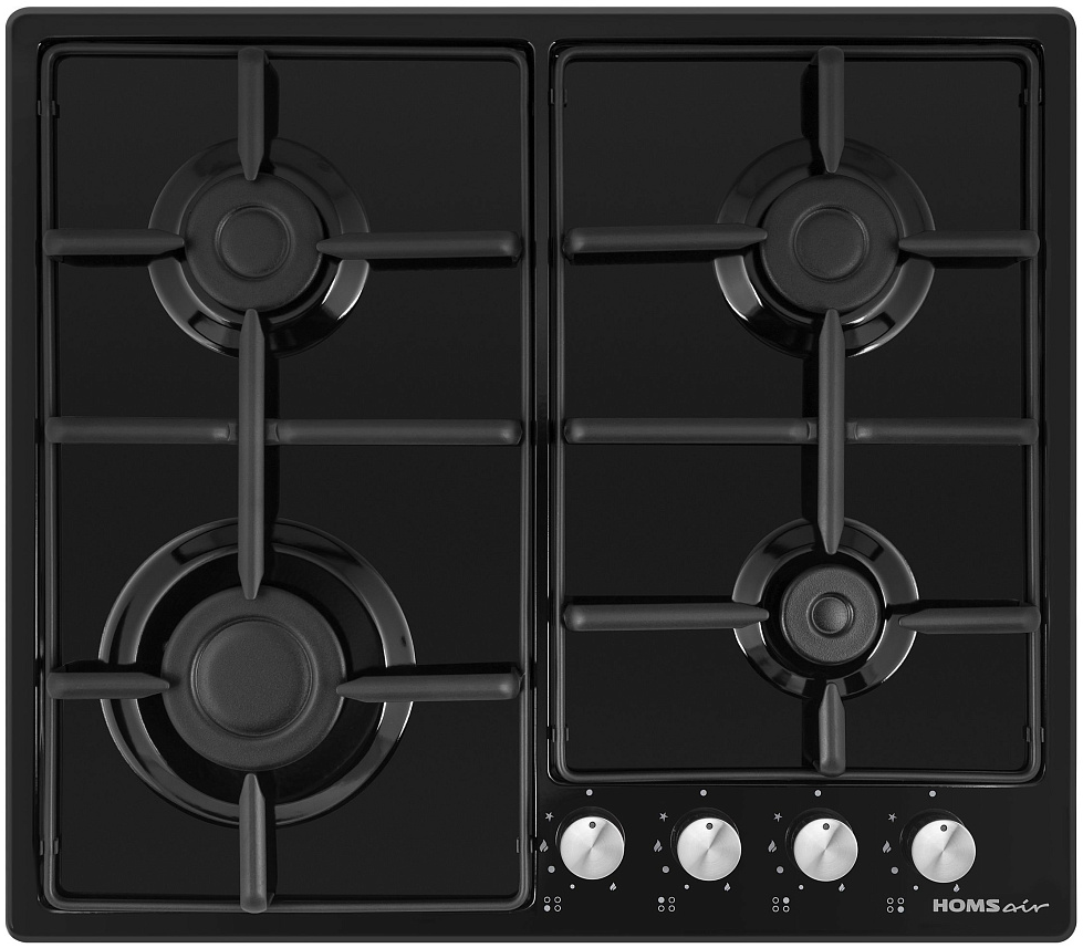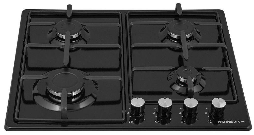 поверхность газовая, 60 см, газ на эмали, 4 конфорки, решетки эмалированные, черный