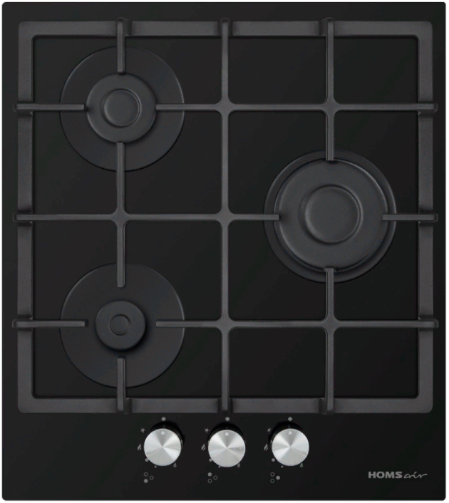 поверхность газовая, 45 см, газ на стекле, 3 конфорки, решетки чугунные, черный