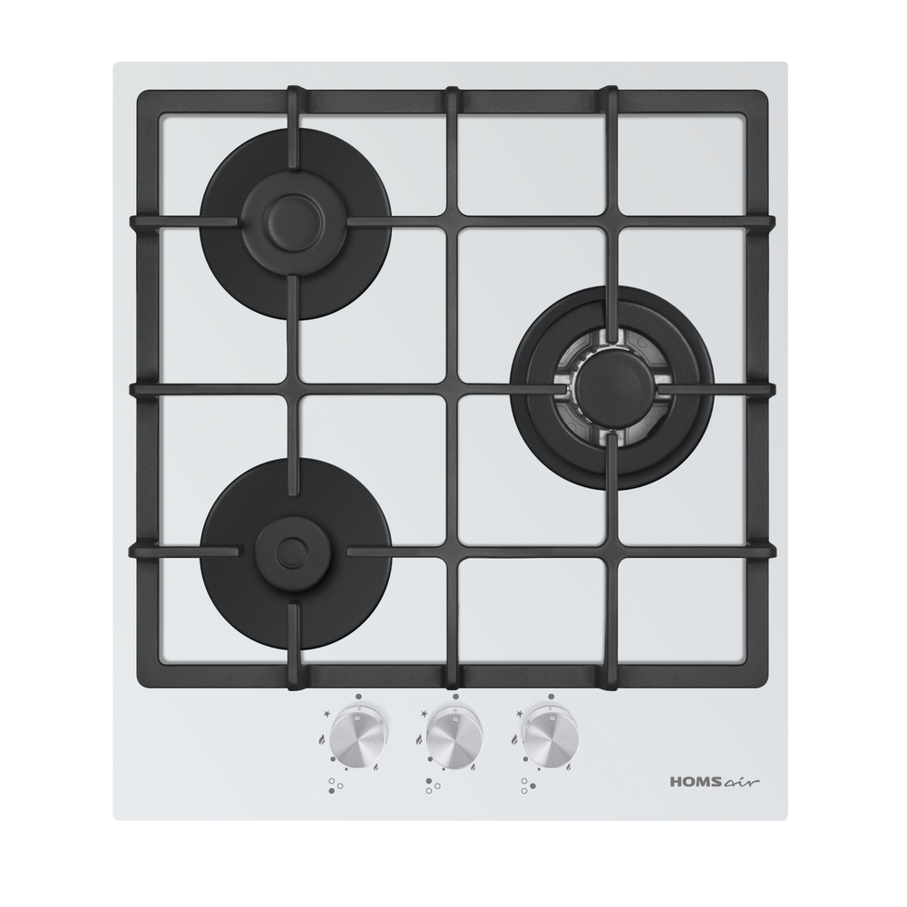 поверхность газовая, 45 см, газ на стекле, 3 конфорки, решетки чугунные, белый