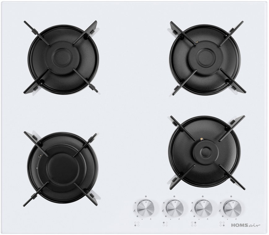 поверхность газовая, 60 см, газ на стекле, 4 конфорки, решетки эмалированные, белый