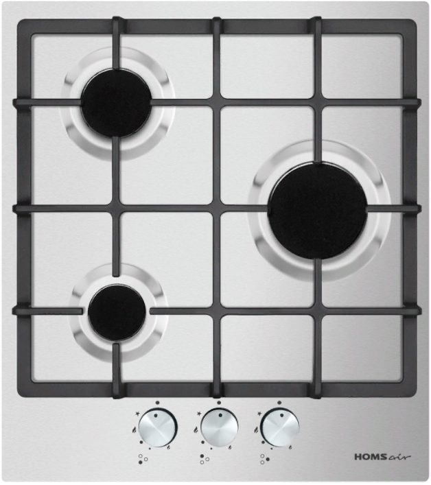 поверхность газовая, 45 см, газ на металле, 3 конфорки, решетки эмалированные, нержавеющая сталь