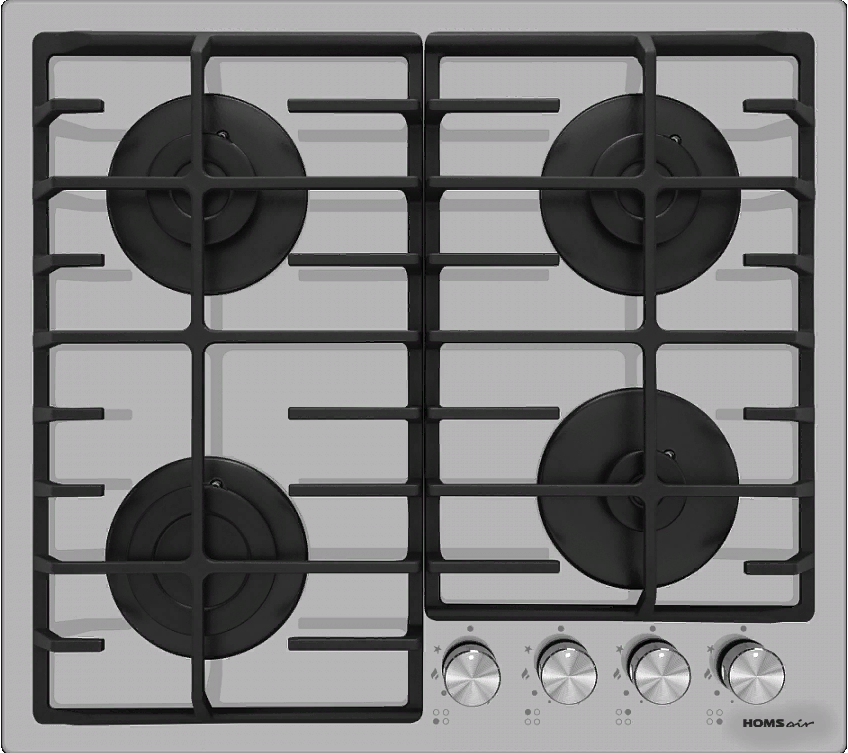 поверхность газовая, 60 см, газ на металле, 4 конфорки, решетки эмалированные, нержавеющая сталь