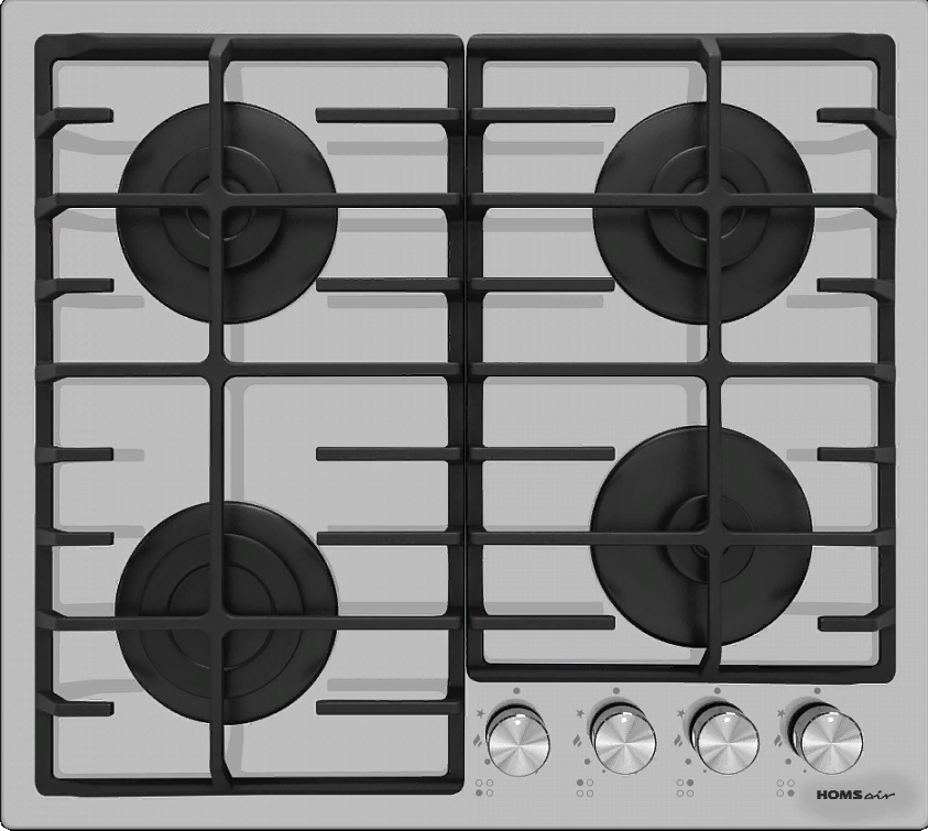 поверхность газовая, 60 см, газ на металле, 4 конфорки, решетки эмалированные, нержавеющая сталь