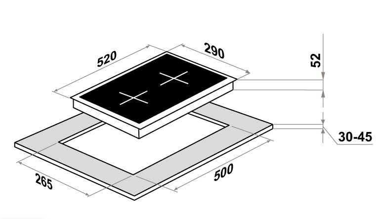 Характер огранки фаски на внешней стороне варочной панели. Металлические рамки предотвращают забивание монтажных швов крошками и пылью.