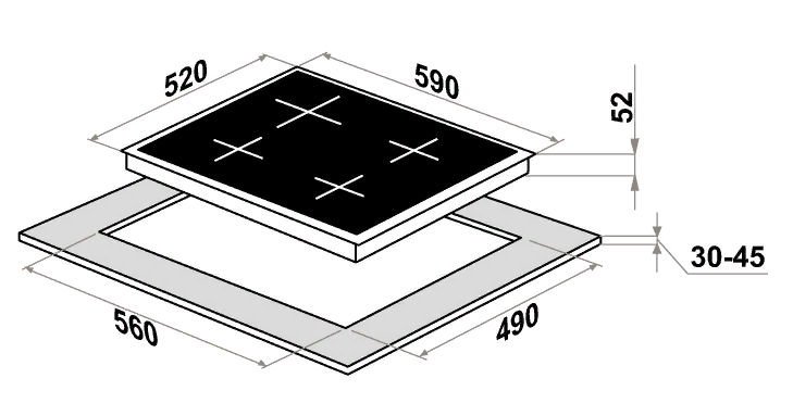 Характер огранки фаски на внешней стороне варочной панели. Металлические рамки предотвращают забивание монтажных швов крошками и пылью.