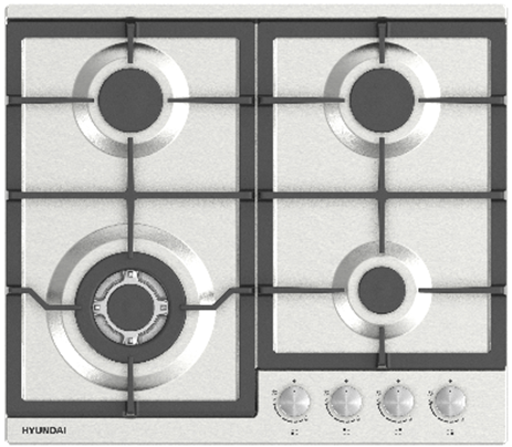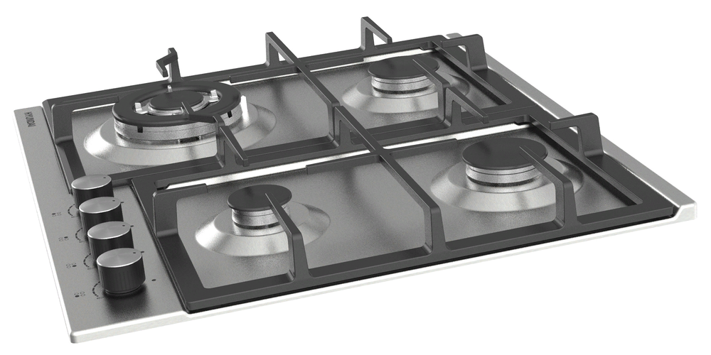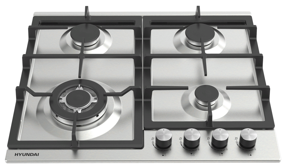 поверхность газовая, 60 см, газ на металле, 4 конфорки, решетки чугунные, серебристый