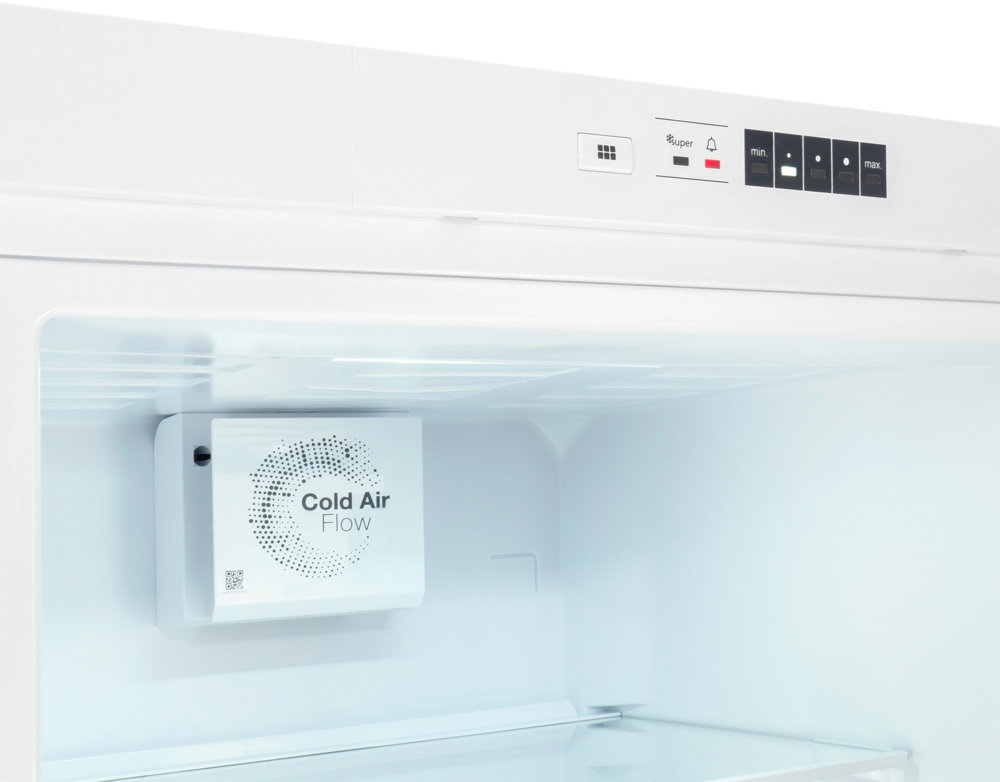 Электронное управление. Над верхней дверцей находится панель управления. Устанавливайте нужную температуру в холодильнике нажатием на одну кнопку. Светодиодные индикаторы покажут, какой режим выбран.