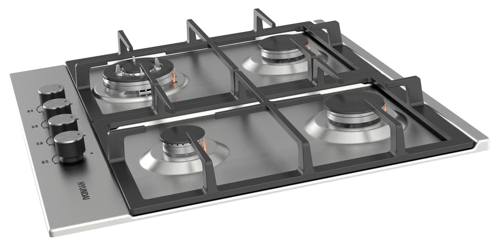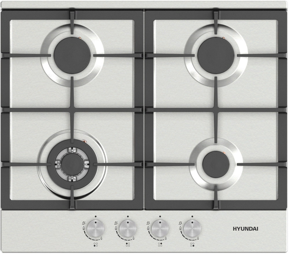 поверхность газовая, 60 см, газ на металле, 4 конфорки, решетки чугунные, нержавеющая сталь