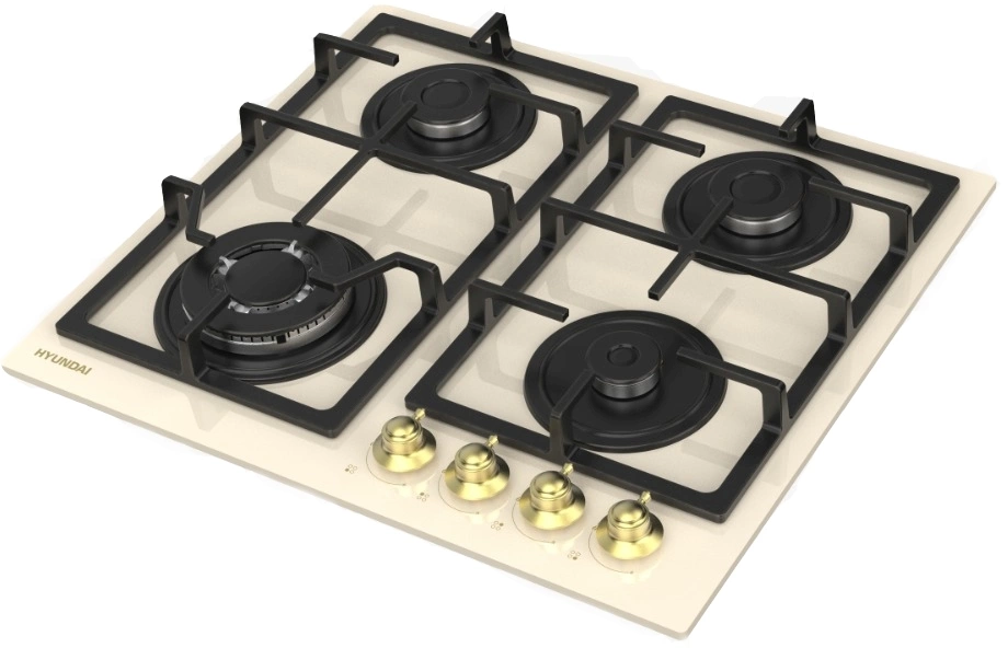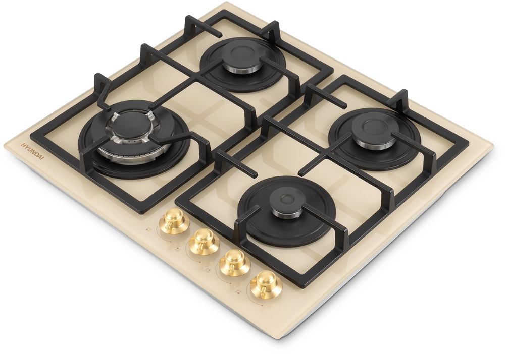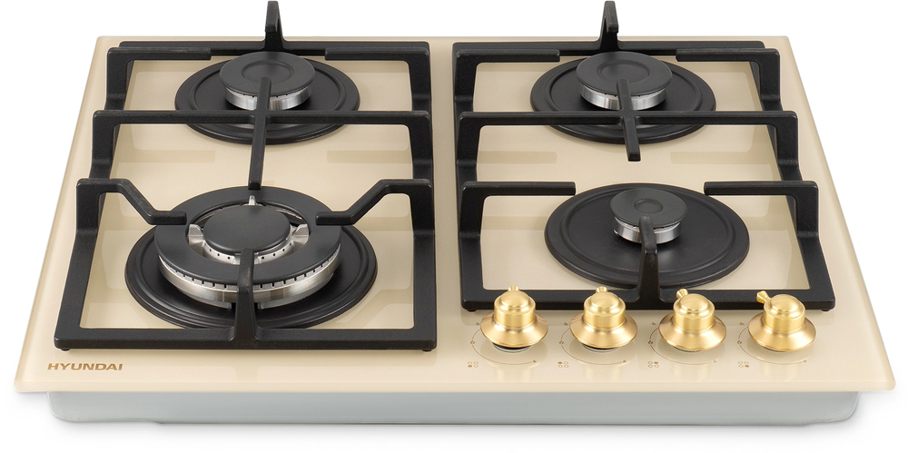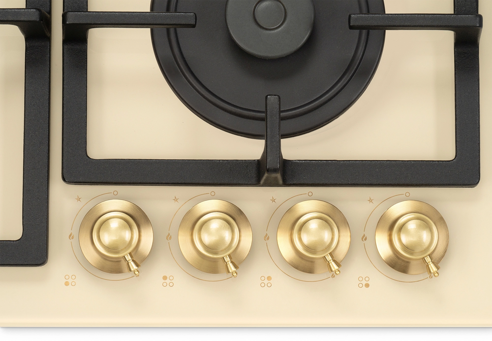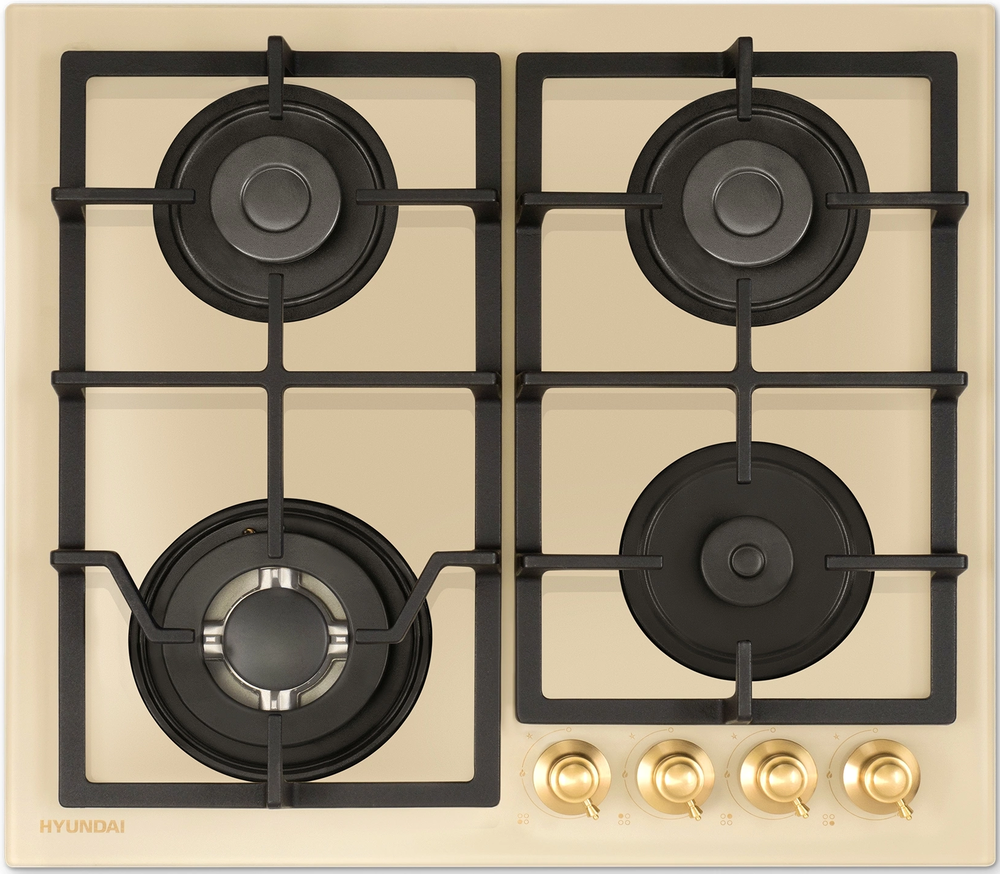поверхность газовая, 60 см, газ на стекле, 4 конфорки, решетки чугунные, бежевый