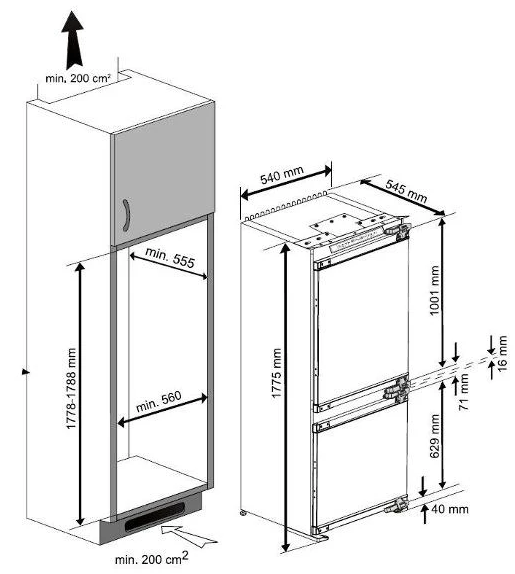 холодильник-морозильник встраиваемый, 262 л, класс энергопотребления А+, No Frost, 54х54,5х177 см