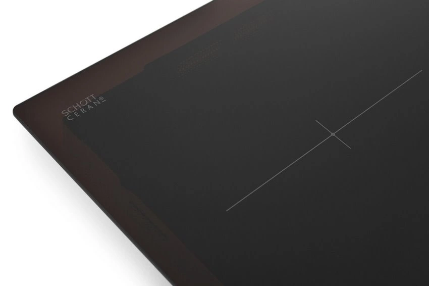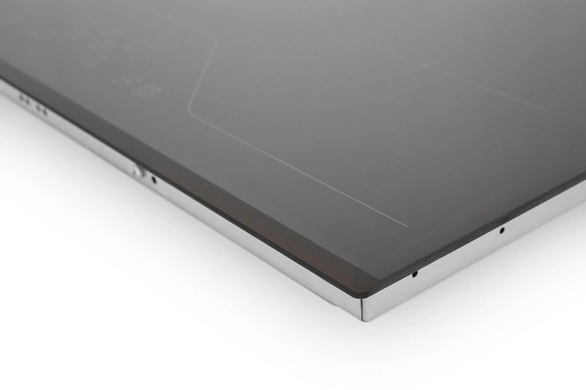 Характер огранки фаски на внешней стороне варочной панели. Металлические рамки предотвращают забивание монтажных швов крошками и пылью.