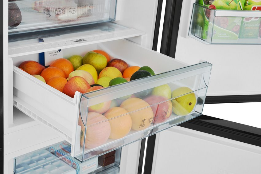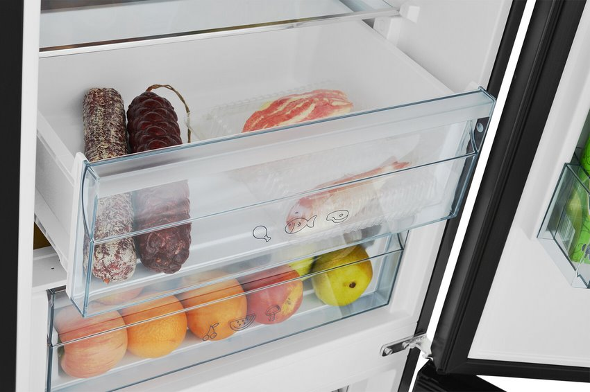 В зоне свежести температура держится на уровне 0°С, так продукты дольше остаются свежими. Подходит для свежего мяса, рыбы, фруктов, овощей.