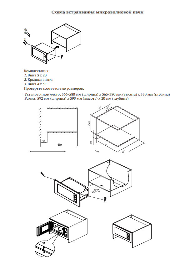 микроволновая печь встраиваемая, 20 л, 59,2х31,3х37,6 см, черный