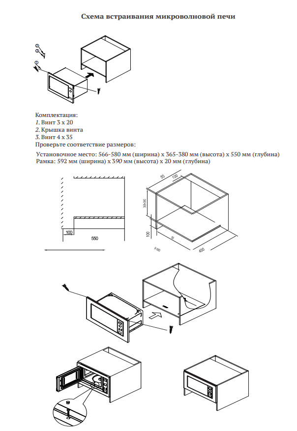 микроволновая печь встраиваемая, 20 л, 59,2х31,3х37,6 см, нержавеющая сталь