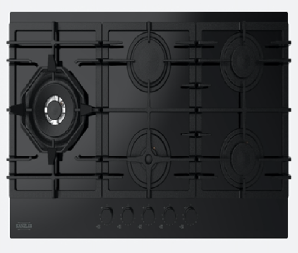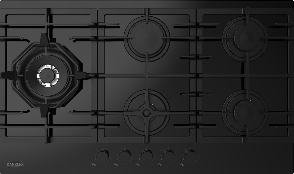 поверхность газовая, 90 см, газ на стекле, 5 конфорок, решетки чугунные, черный