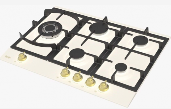 поверхность газовая, 70 см, газ на эмали, 5 конфорок, решетки чугунные, античный белый/золото
