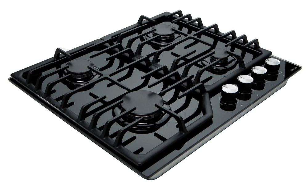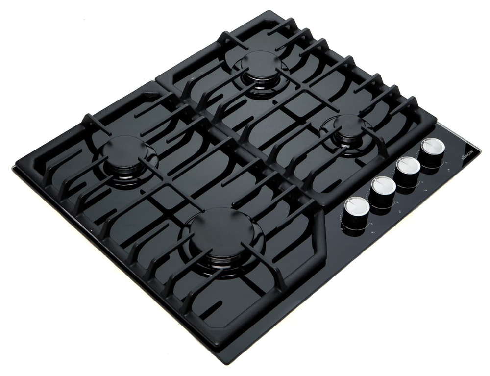 поверхность газовая, 60 см, газ на стекле, 4 конфорки, решетки чугунные, черный