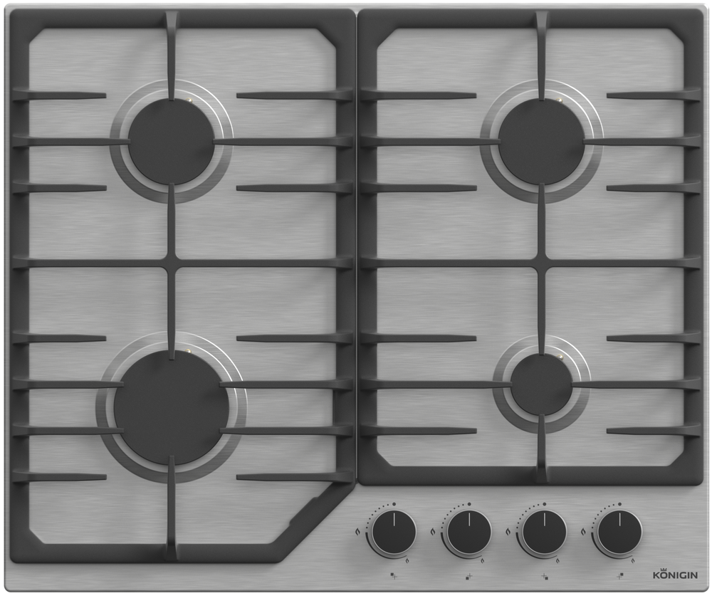 поверхность газовая, 60 см, газ на металле, 4 конфорки, решетки чугунные, нержавеющая сталь