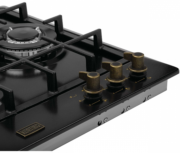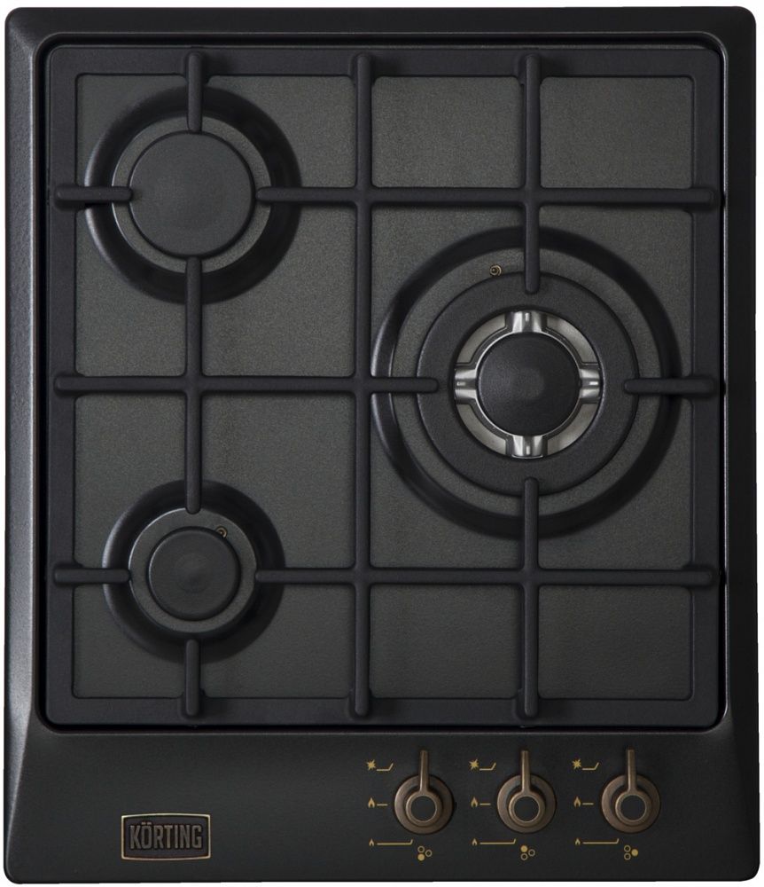 поверхность газовая, 45 см, газ на эмали, 3 конфорки, решетки чугунные, черный, фурнитура - бронза