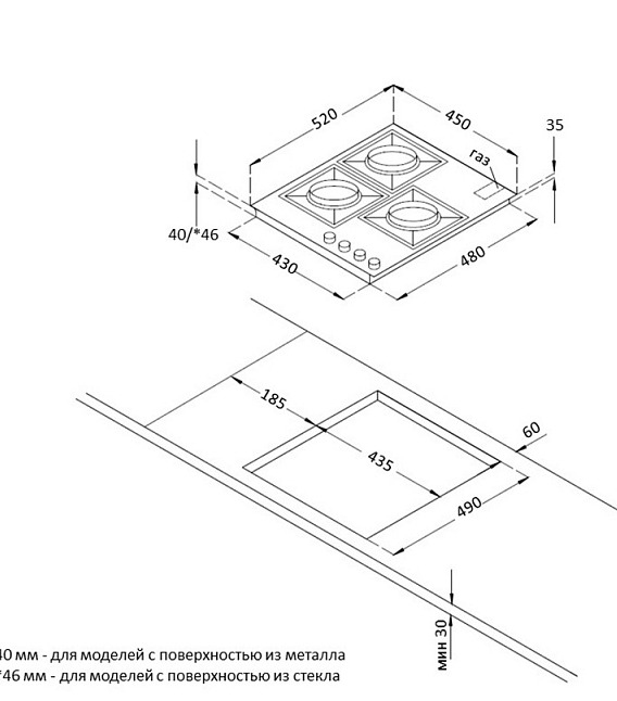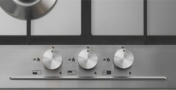 поверхность газовая, 45 см, газ на металле, 3 конфорки, решетки чугунные, нержавеющая сталь