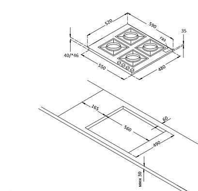 поверхность газовая, 60 см, газ на эмали, 4 конфорки, чугунные решетки, нержавеющая сталь