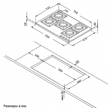 поверхность газовая, 75 см, газ на металле, 5 конфорок, чугунные решетки, нержавеющая сталь