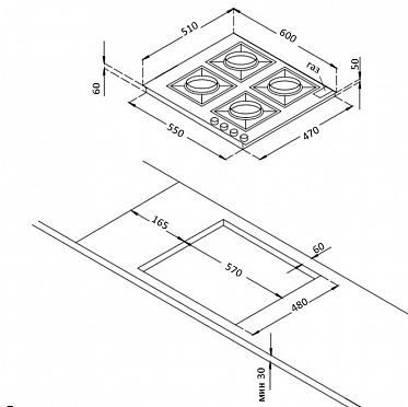 поверхность газовая, 60 см, газ на стекле, 4 конфорки, решетки чугунные, черный