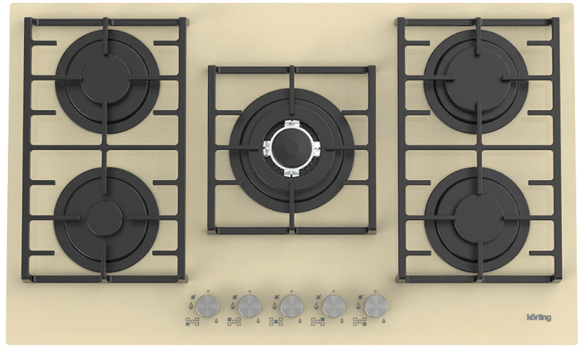 поверхность газовая, 90 см, газ на стекле, 5 конфорок, решетки чугунные, бежевый