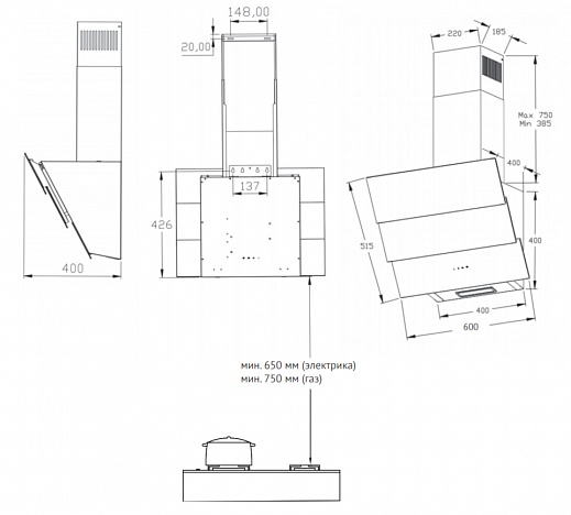 вытяжка наклонная, 60 см, 850 м3/ч, белое стекло