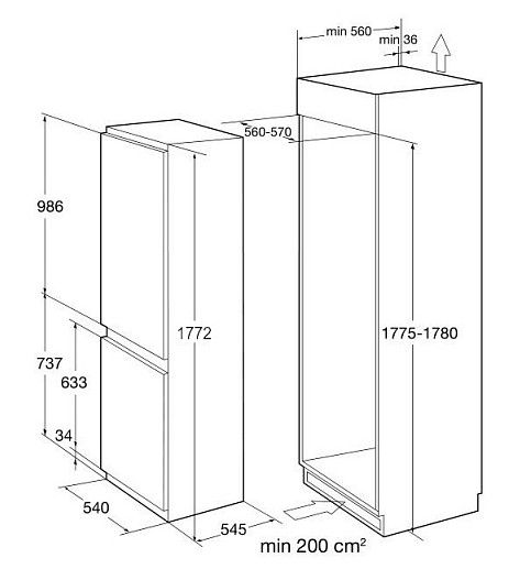 холодильник-морозильник встраиваемый, 248 л, класс энергопотребления А+, No Frost, 54х54,5x177.2 cм, белый
