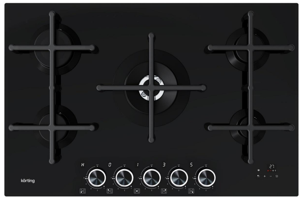 поверхность газовая, 76 см, газ на стекле, 5 конфорки, решетки чугунные, черное стекло