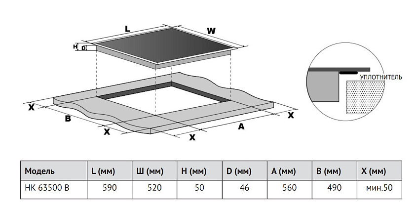 Характер огранки фаски на внешней стороне варочной панели. Металлические рамки предотвращают забивание монтажных швов крошками и пылью.