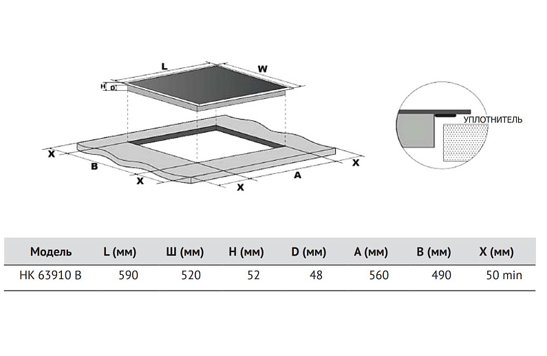 Характер огранки фаски на внешней стороне варочной панели. Металлические рамки предотвращают забивание монтажных швов крошками и пылью.