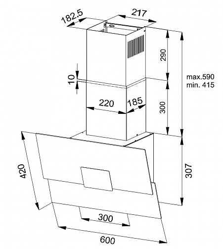 вытяжка наклонная, 60 см, 550 м3/ч, черное стекло + черная нержавеющая сталь