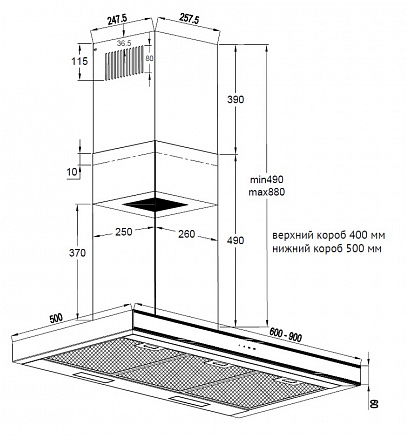 вытяжка пристенная, 60 см, 800 м3/ч, нержавеющая сталь + черное стекло