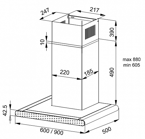 вытяжка пристенная, 60 см, 950 м3/ч, черное стекло + нержавеющая сталь