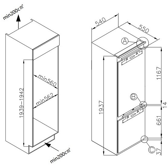 холодильник-морозильник встраиваемый, 267 л, класс энергопотребления А+, No Frost, 54х54x193,7 cм
